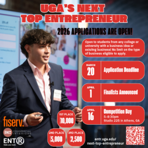 The UGA Entrepreneurship Program invites current students from any college or university to take part in UGA’s Next Top Entrepreneur Pitch Competition on Thursday, April 16, 2026, from 5–8:30 p.m. at the UGA’s Studio 225 (225 W. Broad St.) in Athens.